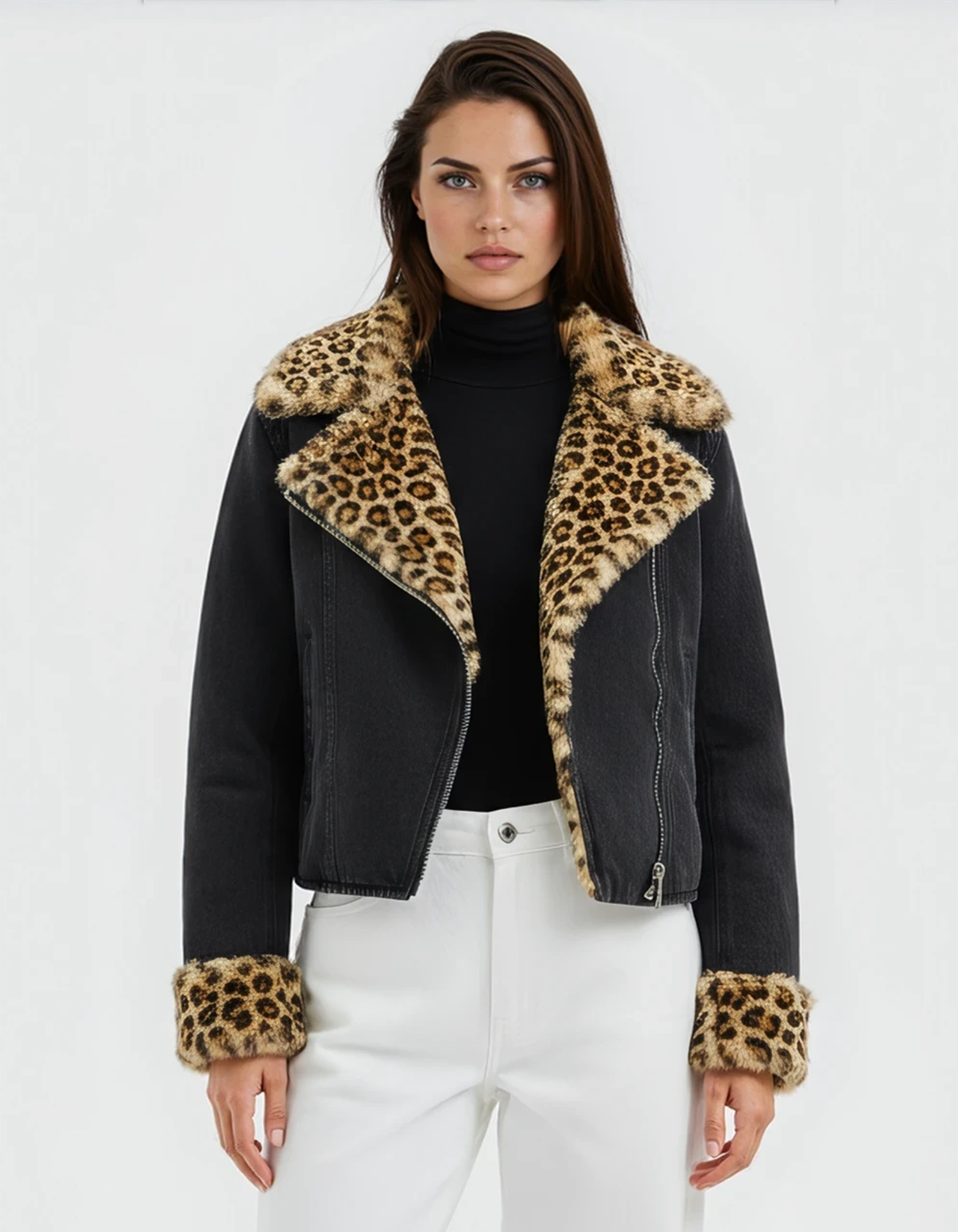 Giubbino Denim inserti Ecopelliccia maculata BORMIO